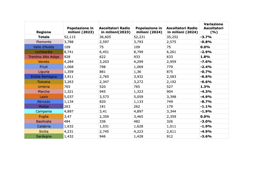 Dati 1° semestre 2024: tutte le variazioni dell’ascolto radiofonico regione per regione