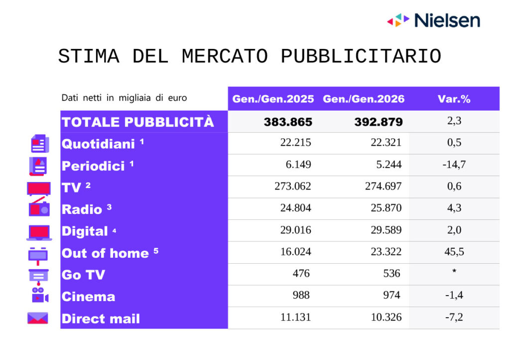 Il 2026 inizia sotto i migliori auspici per il comparto pubblicitario italiano. Nonostante un contesto geopolitico complesso, caratterizzato dalle tensioni in Medio Oriente e dalle oscillazioni dei costi energetici, i dati Nielsen Ad Intel di gennaio consegnano un quadro incoraggiante: un +3% complessivo che scalda i motori in vista di un anno dominato dai grandi eventi sportivi. Ma se guardiamo dentro i numeri, la vera notizia per noi professionisti dell’etere è una sola: la Radio non solo tiene, ma accelera.